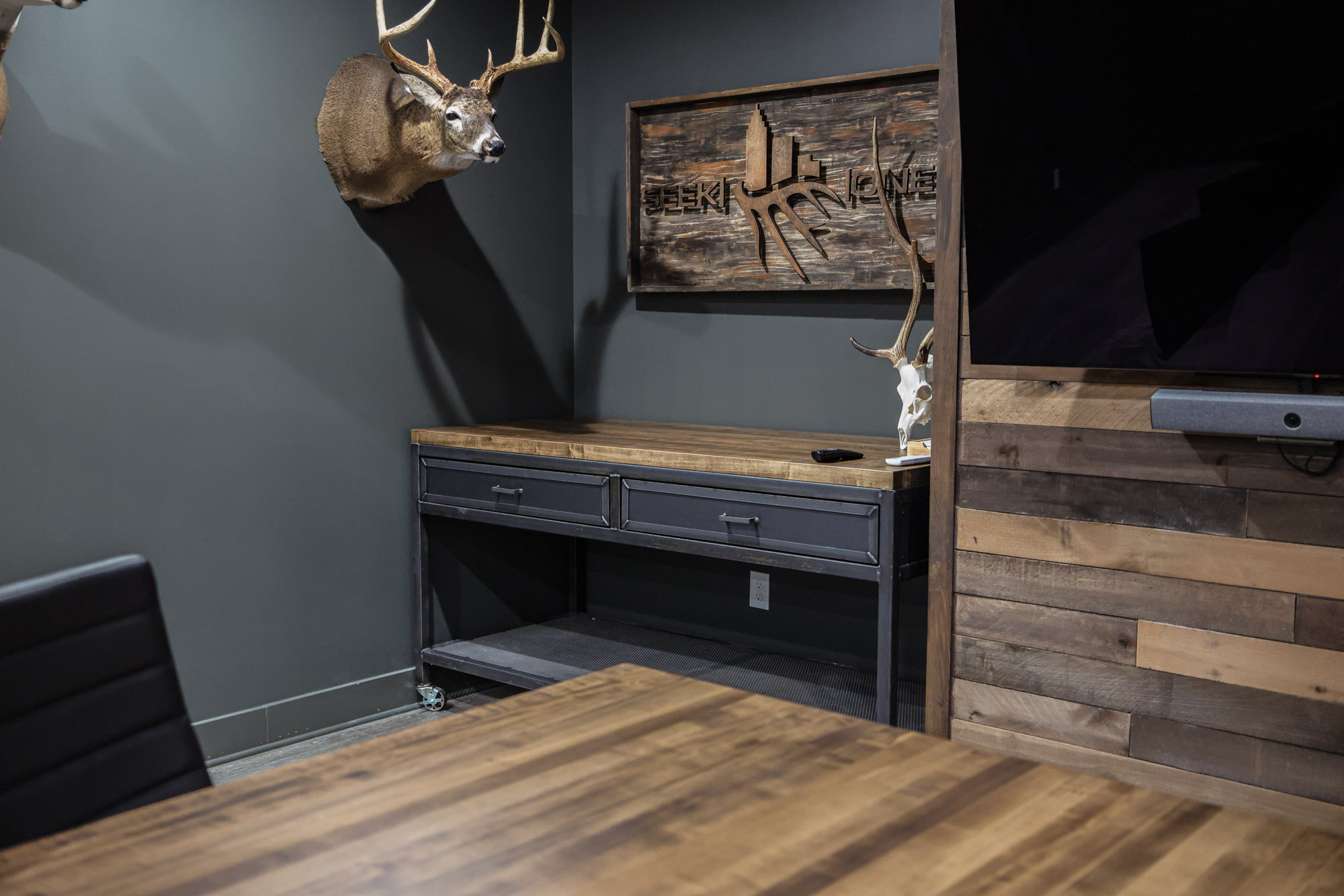 For this project, Iron Age Office leaned into that same mindset and translated it into their workspace. The space is anchored by a powerful IAX conference table featuring a custom epoxy logo with integrated LED lighting, that immediately defines the room. Throughout the office, the Fortis workstation and Knight V3 desk bring consistency and strength. A fully custom Edwin Cooler Credenza with a built in sink and an IA Mobile Island add a layer of functionality designed for both daily use and hosting. Every piece was built to feel intentional, not just placed.