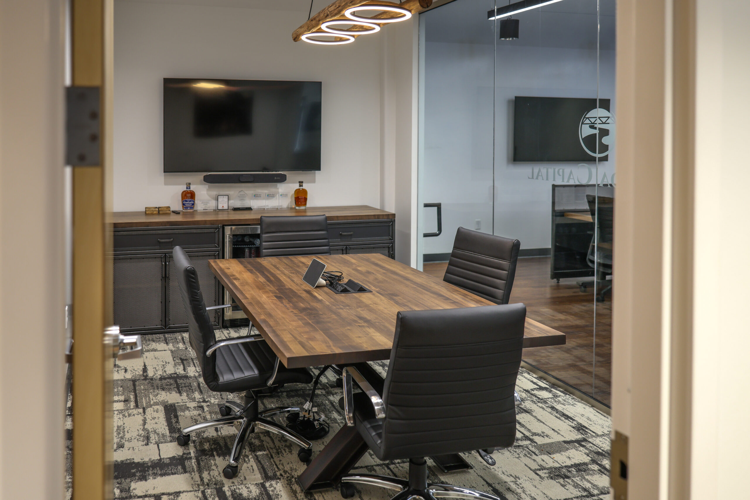 The glass-wrapped conference room upstairs says everything without saying a word. The IAX Table and Edwin Credenza make it clear this is where decisions get made, and the fact that the room is visible from the first floor makes it an instant focal point. Just steps away, a full bar and lounge with a Rowan Coffee Table add a space to slow down and connect after the workday.